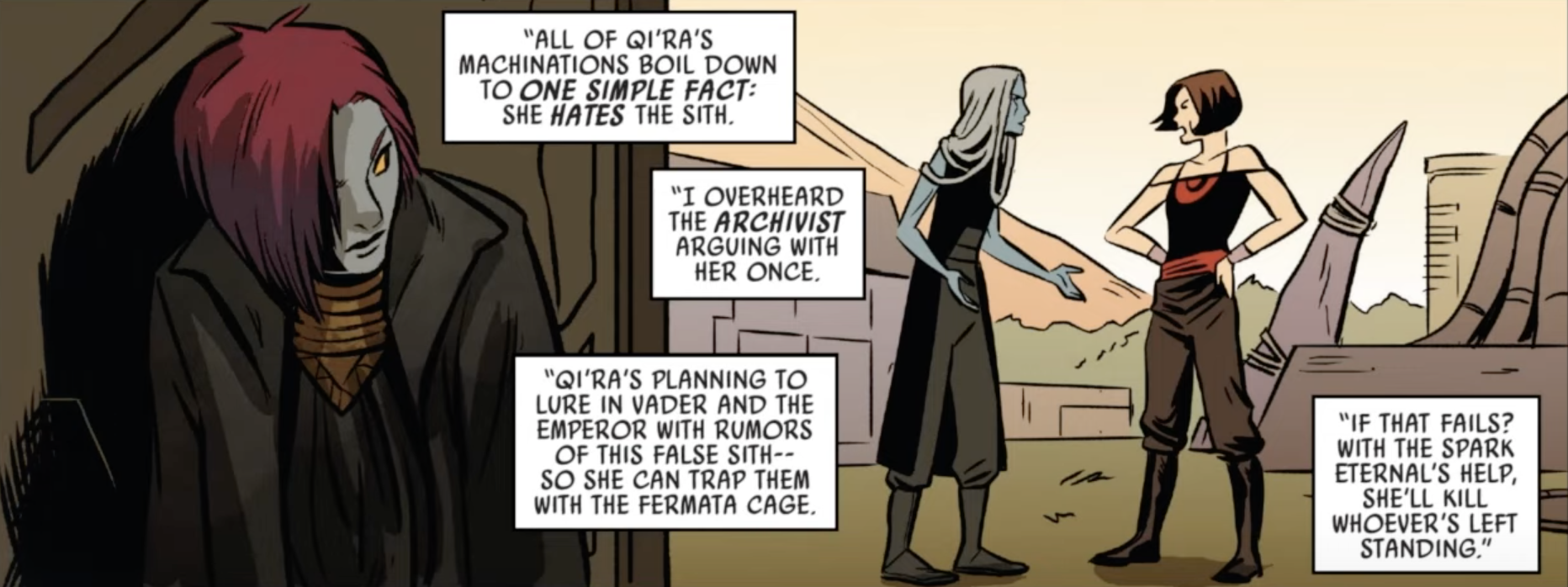 Meanwhile, Sana Starros and her team confront Kho Phon Farrus and demand that they explain their actions. Kho goes on to confess Qi’ra’s plan to destroy Emperor Palpatine. Utilizing an ancient device called the Fermata Cage, Qi’ra intends to use an ancient legend about a Sith spirit inside the Cage to lure Palpatine to her and seal him inside the cage forever. With Kho’s reluctant cooperation, Sana and her team leave to confront Aphra at the Amaxine space station; the future lair of Supreme Leader Snoke. The issue then ends with the Spark taking full control over Aphra and leaving to confront Vader and Sidious alongside Qi’ra at the space station.