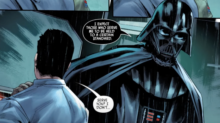 Meanwhile, Beilert Valance, Jyala Haydenn, and the Revengers were summoned to the Executor by Darth Vader. As they entered a turbolift, Haydenn attempted to fix Valance’s collar, warning that the Dark Lord noticed every detail. Once they reached Vader, he chastised them for arriving early. Out of patience, Valance demanded to know why they had been called. In response, Vader used the Force to fix Valance’s collar, saying that he expected those who served him to be held to a certain standard.
