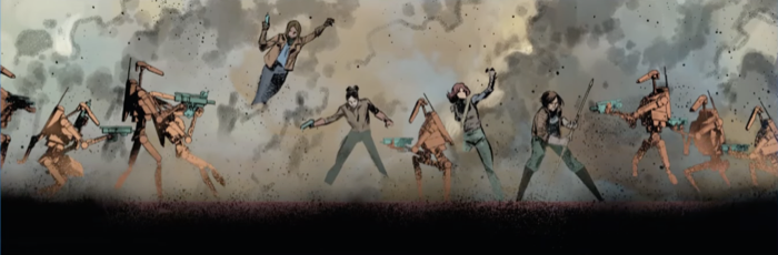 As the handmaidens fight off the battle droids, Sabé tries once again to convince Jul that he will lose against Vader and that the Skakoan refugees under his care will be killed. But Jul refuses to listen as he sends another platoon of droids to attack the local farmers and lure Vader’s forces into a canyon. When Vader says this opportunity will be another test for them, the handmaidens refuse to abandon the locals and insist that Vader help them save them. Vader reminds them that they do not give the commands, but that he will lead them into battle.
