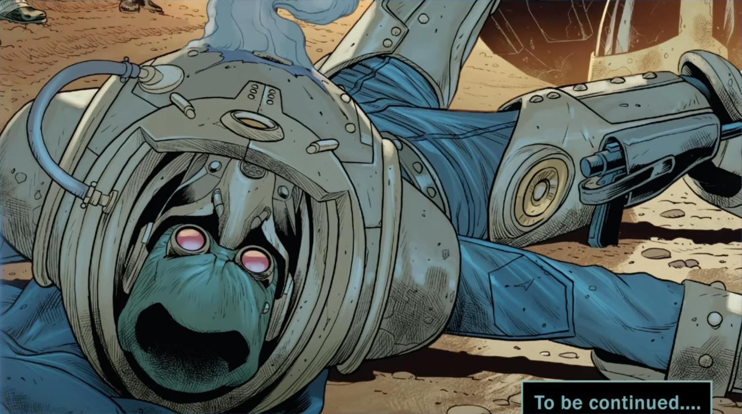 Meanwhile, we see that Sabé has tracked Jul Tambor to a marketplace on Brentaal IV. As Tambor tells his fellow Skakoans that he will liberate them from the Empire, they are ambushed by Ochi’s former helpers, the Droid Crush Pirates. Sabé assists Tambor in fighting off the pirates, to which he thanks her and shows her how much his fellow Skakoans have been struggling under Imperial rule. However, droid mercenary and former Revenger Gee-Ninety warns Tambor that Sabé is working for Vader, to which Tambor admits that he was hoping to bring her to his side. Tambor tells Sabé he’s planning to kill Vader for killing his father and oppressing his people. To this, Sabé warns Tambor that Vader will kill him and his people.