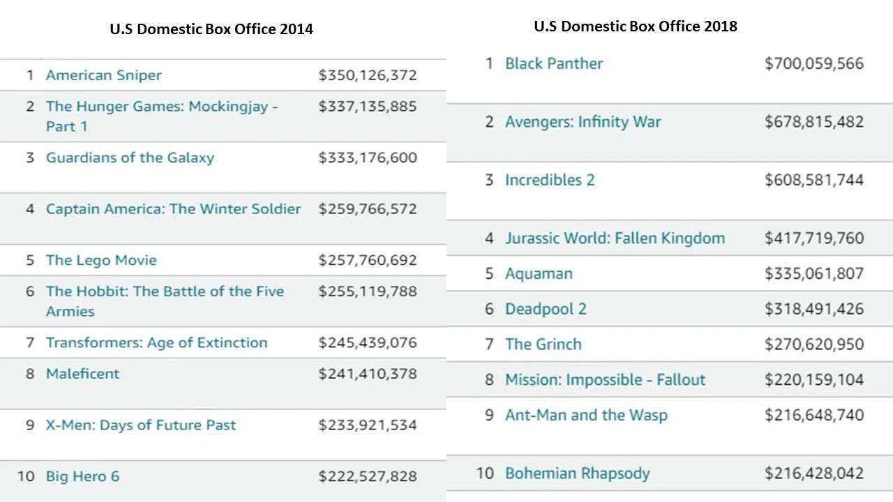 In 2014, American Sniper tops the box office, with The Hunger Games and Lord of the Rings featuring highly. By 2018, six out of the top ten films are superhero based. Hollywood had a few big hits and would never let the general public forget it.