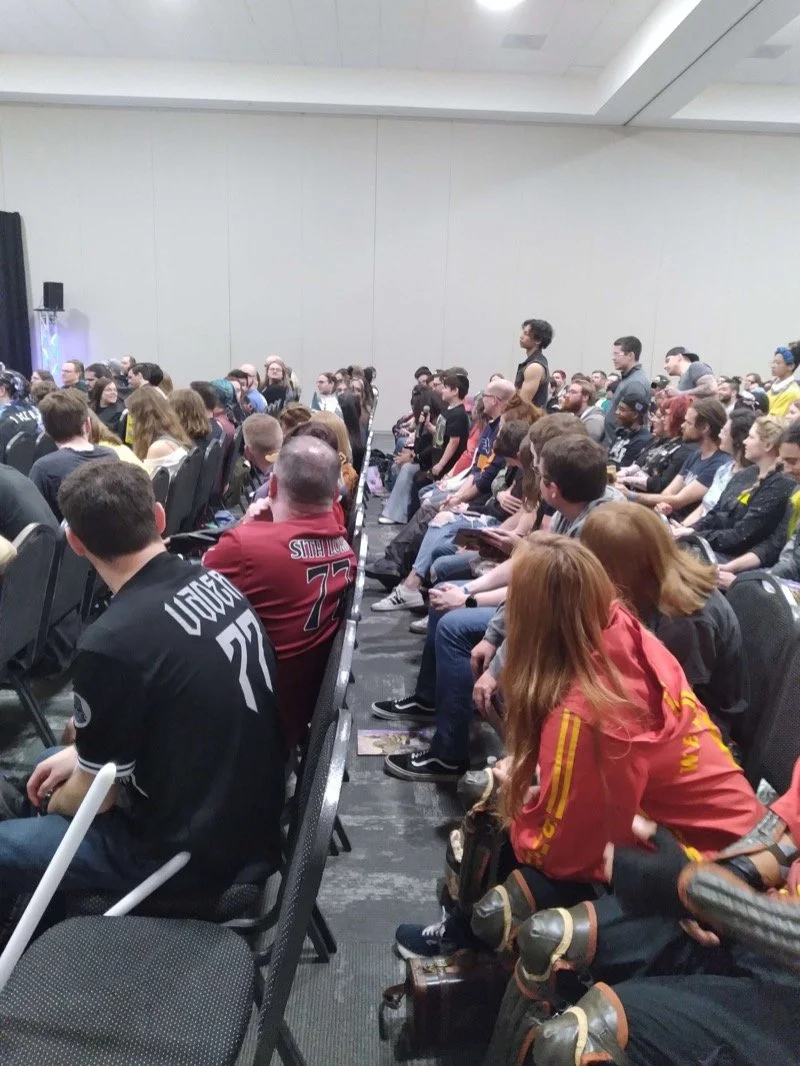 I could barely see my child’s head over the seated audience members, but as he was right in the center aisle of the room, I knew he was safe, so I settled my attention on the questions being asked by the other attendees. These ranged from professional questions, such as: “How do you find a voice for a character?” Ashley’s advice for this was, “We were like Padawans coming from TV and film. If you have an idea for a character, go for it! Commit to the character. When you go over the top, that’s when you’ll get it.” James’s answer was to “study the voices; then you can have a chance to do your own!”. He also emphasized that it is important to actually like your own voice! Other questions were more general, asking the trio who their favorite Clone Troopers were. Ashley likes Omega from The Bad Batch, saying she reminds her of a young Ahsoka. James said it was 99, as his character shows what a great voice actor Dee Bradley Baker is. Matt’s is Rex.