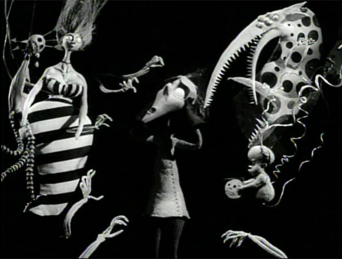 Shot in striking black and white, the film is a pastiche of 1920s-era German Expressionist films. Celebrating the macabre and the dark aesthetic that Burton would eventually go on to be known for, he creates a complete character study in six minutes. As the short goes on, Vincent imagines himself in numerous scenarios inspired by Edgar Allan Poe and Vincent Price, both of whose films had an effect on Burton as a young child. He welcomes his Aunt into his house while envisioning dipping her in hot wax for his museum; a callback to Price’s House of Wax. He also imagines doing experiments on his dog, Abercrombie, including turning him into a zombie. This would later serve as the inspiration for Frankenweenie, first as a short film, and then as a full-length animated feature film. Eagle-eyed fans may notice a pre-The Nightmare Before Christmas Jack Skellington and a Saturn Sandworm from Beetlejuice.