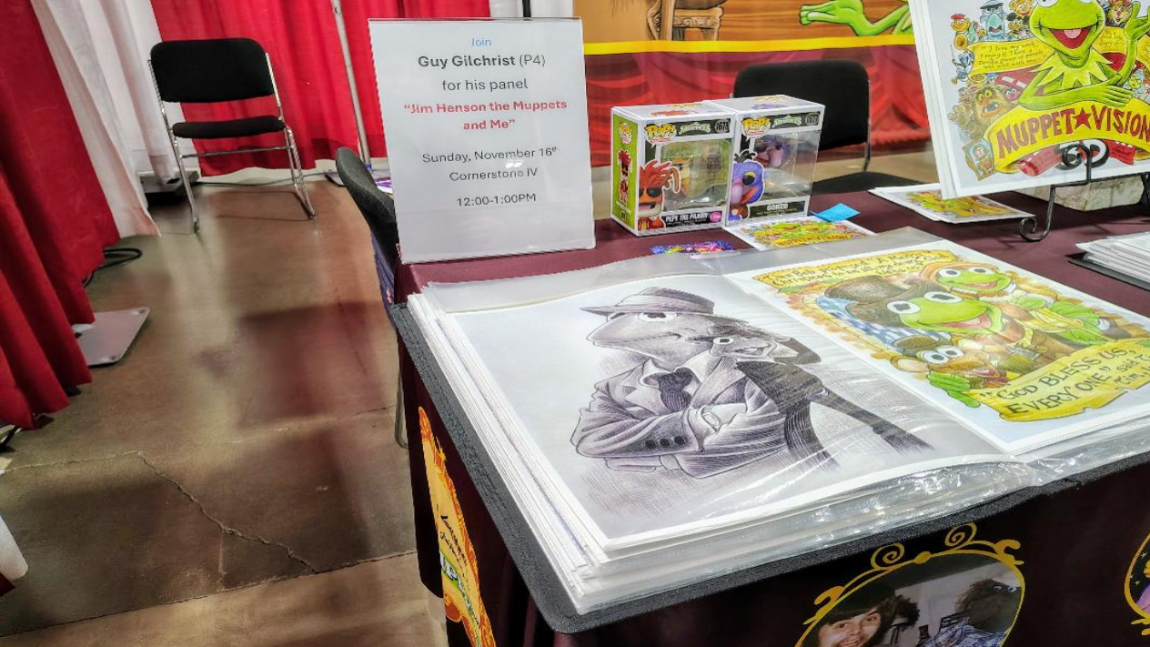 A binder of drawings and illustrations, Funko POP, and a sign on the table at Guy Gilchrist’s booth at the Motor City Comic Con