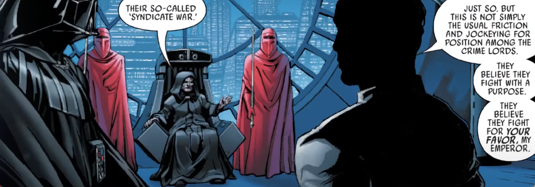 In the final issue of Crimson Reign, we see the Emperor look over everything occurring within the Empire throughout the miniseries. From the assassination of his royal guards to the break-in at Fortress Vader on Mustafar, Sidious has come to believe these events are connected. To confirm his suspicions, the Emperor calls in one of his most trusted agents, Director Barsha, who leads a unique division within the Imperial Security Bureau. Barsha reports his findings concerning a rumor that the galaxy’s most powerful crime syndicates were fighting one another for an alliance with the Empire. Barsha claims that the rumor came from a single source; Crimson Dawn. This confirms for Sidious that the crime syndicate has targeted the Sith and leads him to declare Crimson Dawn their next primary target. But one question still remains; who exactly is Director Barsha?