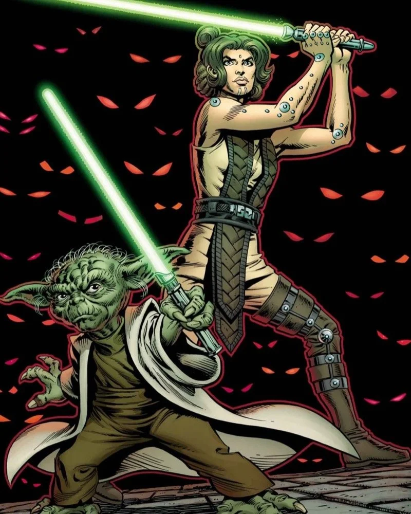 Guggenheim is particularly proud of the second issue since it sees the introduction of a character whose name he’s apparently been saving for a Star Wars story for some time: Vetna Mooncrest. A newly knighted Jedi, Vetna has a disability that she has had to overcome, and if this writer had to guess, it has something to do with her mobility given she seems to have extensive physical enhancements as indicated by a series of metal nodes dotted over her body. She has been paired up with Master Yoda, with Guggenhim hoping to show the difference between the generations, and to let her shine next to the Jedi Master.