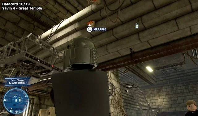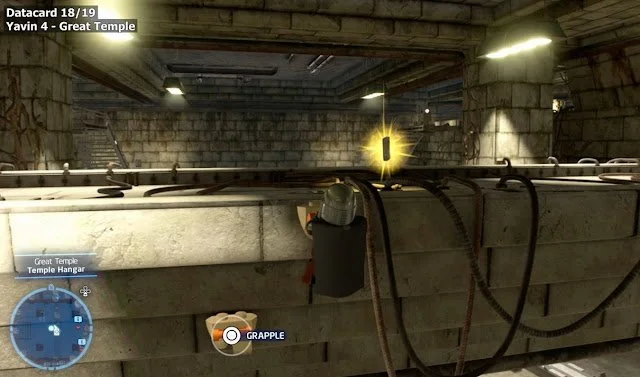 The Datacard located in Yavin 4 is in the Great Temple. In order to get it, you have to go to the center of the Temple Hangar and stand on the left side under the brick bridge located on the roof.