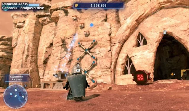 To get the Datacard in Geonosis you have to go to the Stalgasin Hive area. Walk from the landing pad forward until you reach the canyon area in the center of the map. Once there you will find a tall cliff with some orange LEGO bricks. Grapple and climb up to the top.