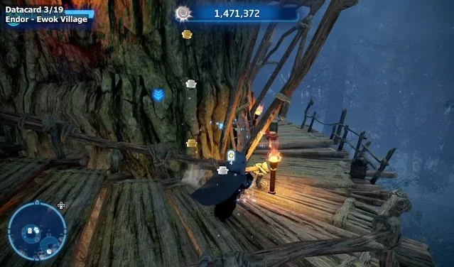 Afterward, you will need to climb up, find a stick on the ground, and use the Force to attach it to the missing spot on the cliff. Then, you will have to move along the different orange handles to cross the rest of the cliff. Once at the top, you will have to double jump over a gap, and then you will find the Datacard.