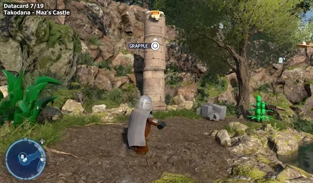 To get the Takodana Datacard in Maz’s Castle, head west from the landing zone along the lakeshore. You will have to grapple to the pillar past the fisherman. Once there, a button will appear.