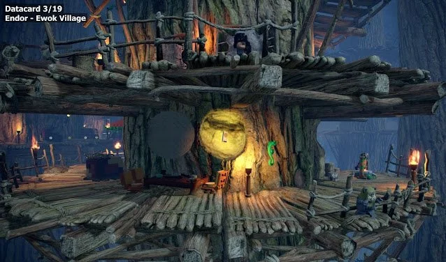 The Datacard on Endor is located in the Ewok Village. You have to turn right from the landing area and go down to a walkway around a tree trunk.