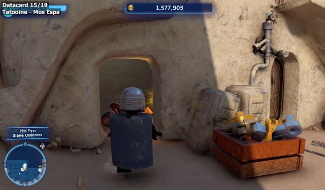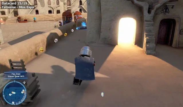 The third and last Datacard found on Tatooine is in Mos Eisley. In order to get it, you must go to the area called Civilian Quarters, which is located in a northerly direction. You will find a large building with three red and white awnings on it. The Datacard is floating under the central awning. To get it you just have to use the Force to create a platform using the nearby Legos and then double jump to reach the Datacard.