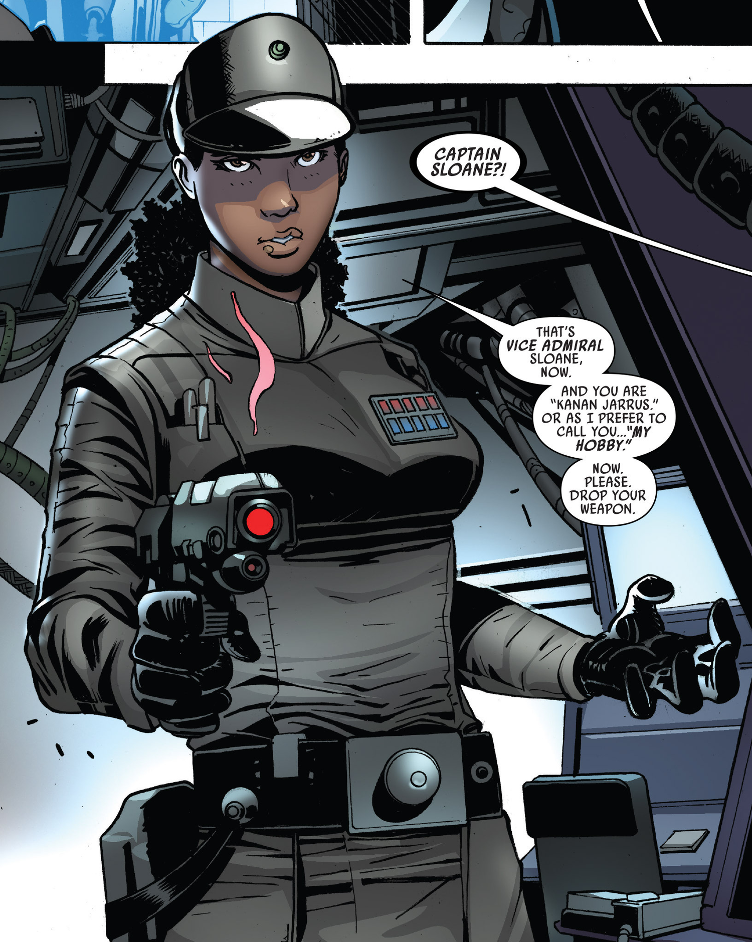 Over the coming years, Sloane would make her way up to the rank of commander, and come to serve under Wilhuff Tarkin onboard the Executrix, his personal Star Destroyer. Soon promoted to captain, she was assigned to Count Vidian’s mission to the Gorse system. There, she encountered Kanan Jarrus, Hera Syndulla and others, and was pushed to more closely investigate the Count.