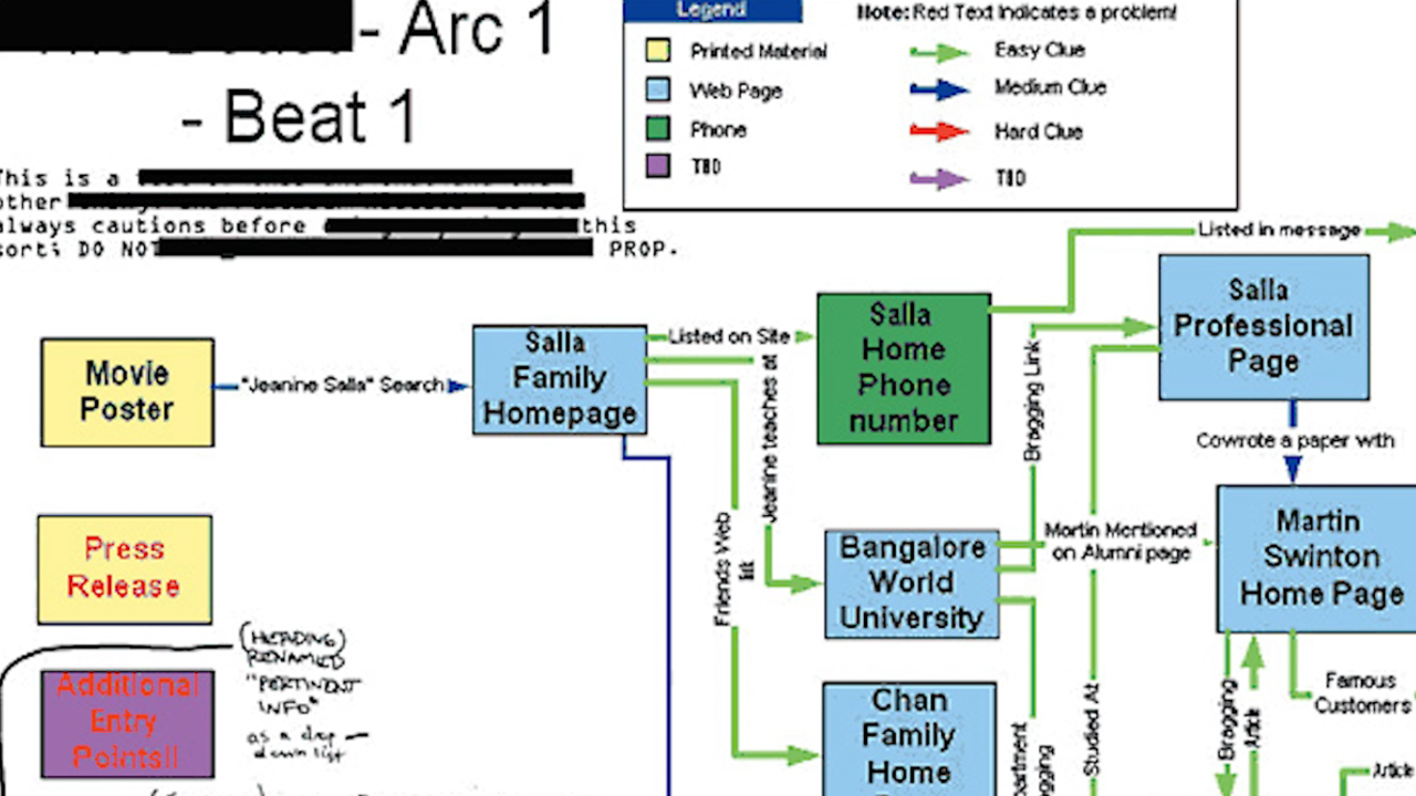 “Jordan’s idea was that we would tell a story that was not bound by communication platform: it would come at you over the web, by email, via fax and phone and billboard and TV and newspaper, SMS and skywriting and smoke signals too if we could figure out how. The story would be fundamentally interactive, made of little bits that players, like detectives or archaeologists, would discover and fit together. We would use political pamphlets, business brochures, answering phone messages, surveillance camera video, stolen diary pages… in short, instead of telling a story, we would present the evidence of that story and let the players tell it to themselves.”