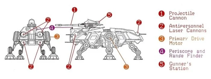 While one pilot managed the legs of the ship, one spotter picked targets and assigned them to five different gunners. Amongst them, there was the main gunner whose cabin was built into the cannon of the most powerful weapon the Walker possessed, the Projectile Cannon, making him the most vulnerable member of the ship. Then, the four other gunners were on the back, the low front, as well as on the sides of the Walker which allowed for the protection of any blind spots with the use of the Antipersonnel Laser Cannons. Additionally, AT-TEs also carried engineers who would conduct maintenance duties to keep the machine working in case of damage.