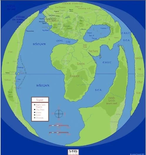 At this point Arda is flat. Tolkien hand-drew some simple canonical maps, and they looked like something a typical fantasy writer would quickly sketch on the back of a notepad to keep their story straight, which is probably what happened. Tolkien also changed his mind and produced two versions with some features that were never mentioned in his writings. In Tolkien’s first attempt, Valinor was in the West and the Lands of the Sun in the East. Most of the action happened in the center where there were a few familiar locations like the Southlands and the Blue Mountains (where a Hobbit would outwit a dragon), etc. Two circular seas were also featured in this version of Arda.
