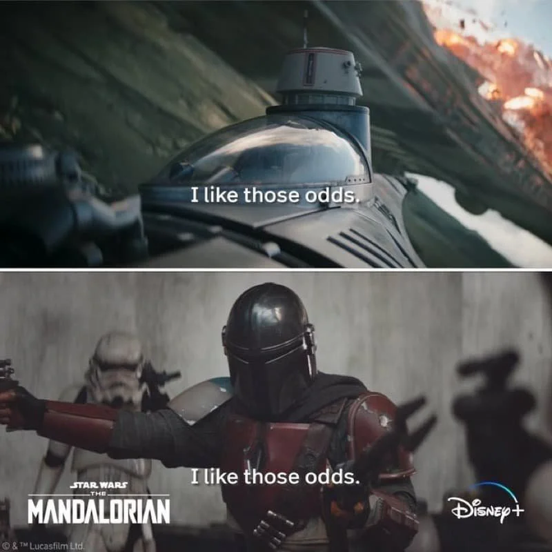 “I like those odds.” is one of the most badass lines from the series. When Din Djarin met The Client in the first episode, he faced off against Stormtroopers who had him outnumbered 4-to-1. Unfortunately for them, Din “likes those odds.” Taking on multiple opponents is no big deal for the cool bounty hunter, who pointed his blaster at one and his pulse rifle at another. This is a line you can quote under similar scenarios in real life where you’re up against more than one opponent or problem. But hopefully, they won’t be pointing their blasters at you! Jon Favreau repeated this line in Season 3, so he’s probably aware of how iconic it is.