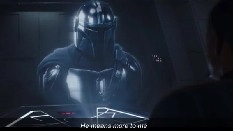 “He means more to me than you will ever know” is a line from The Mandalorian, Chapter 15, “The Believer.” Din Djarin sends a hologram message to Moff Gideon, who kidnapped Grogu in the previous episode. After removing his helmet to obtain the coordinates to Gideon’s ship, Din sends him a message where he repeats, word for word, every line Gideon once said to him regarding Grogu. The difference is, while Gideon refers to Grogu as an “it”, Din refers to him as “he.” This shows that while Grogu is a valuable asset to Gideon, he’s a living, breathing child who means more to Din than Gideon will ever know. No one, including Gideon, has any idea how much Mando loves Grogu, and the lengths he’s willing to go to save him. This line summarizes his love for the child who has become his whole world, and it is a simple but extremely touching example of why the show resonated with so many people.