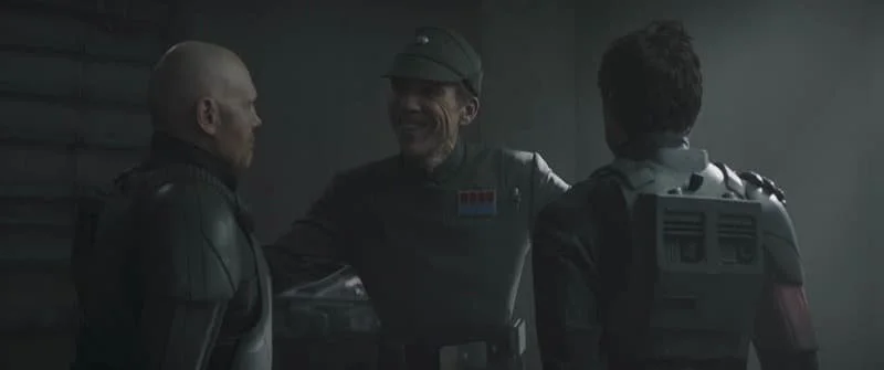 But we aren’t done yet. Unable to escape the officer’s lounge due to their status as “heroes” to the base’s Imperials, Mayfeld’s old commander (who fortunately doesn’t recognize him) sits them all down for a drink. In the following conversation, we see Mayfeld’s discomfort come out, alongside his anger and horror at the events of Operation Cinder, all played without an ounce of comedy from a comedian. We meet a man who relished the slaughter at Burnin Konn, and another who is haunted by it. Operation Cinder was the destruction of cities, whole worlds, though all manner of awful means, and it was an extermination that struck even loyal Imperials either on purpose or simply as collateral damage. Mayfeld, unable to bear interactions with this unrepentant man any further, suddenly shoots the officer dead, blowing the cover of the mission in a moment guided by deep trauma. He might not be Syril Karn, but Migs Mayfeld is still someone who believed in and followed the Empire only to have that loyalty shattered. He was left with very little, but the training they gave him, which he used to help himself and Din Djarin escape.