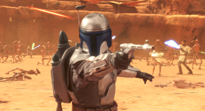 Even though we never see him do any bounty hunting in his short appearance during Attack of the Clones, he is still a bounty hunter. In the short time, we see him, he acts more as a bodyguard for Count Dooku. He can hold his own in a fight against Obi-Wan Kenobi and even succeeds in capturing Obi-Wan and Anakin. His defining moment, before he is killed by Mace Windu, is when he guns down a charging Reek with a single shot.