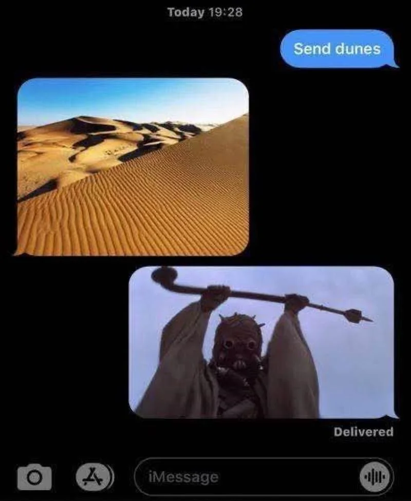 Ask for dunes…receive dunes. Sender beware, though; ya might get a Tusken Raider to go with all that sand. Side note: this might be enough sand to make Anakin leave the chat, don’t you think?