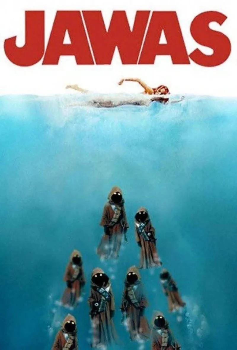 It's wordplay! And Fun! Perhaps this sight in the water wouldn’t engage the fight or flight response in unsuspecting swimmers, not like a monster Great White shark anyway, but it sure might surprise the mischievous sand-dwelling residents of Tatooine to end up out at sea! Could you imagine these small, cloaked, little alien wonders clicking behind you in the ocean?
