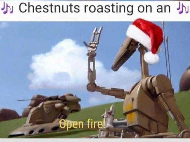 Roger Roger, the Santa hat is simply a chef’s kiss on this droid in a carefully orchestrated Christmas-themed meme. The fact that it perfectly uses the lyrics of “The Christmas Song” with a scene that Star Wars fans instantly recognize offers a fun chuckle for the holidays.