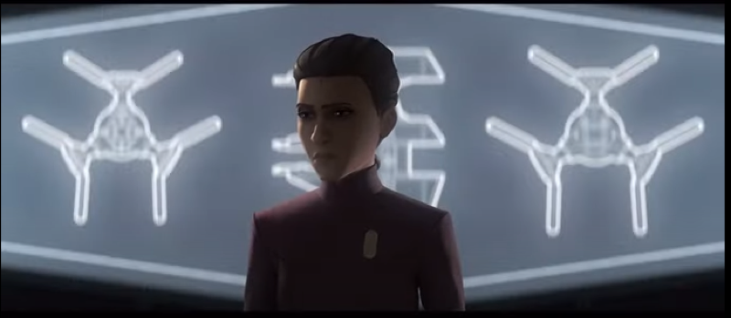 Even though Morgan is the creator of the TIE Defenders, her idea is rejected by her Imperial superiors. She is approached by Captain Gilad Pellaeon, who debuted in Timothy Zahn’s Heir To The Empire book, and his name is the first word in the book as well. In the book, he was Thrawn’s right-hand man. We saw him make his canon, and live-action debut in season 3 of The Mandalorian. Xander Berkely, who played the live-action version, is back voicing him in the animated version.