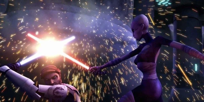 Adopting a yellow lightsaber, rather than the red dual sabers she held previously, Ventress and Vos attempt to remove Dooku, only for the plan to go awry, with Dooku attacking Vos with force lightning. To save his life, Ventress sacrifices herself, dying in the arms of Vos, who - because of her sacrifice - returns to the light side of the force.