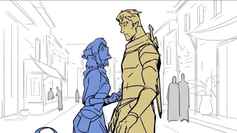 The sneak peek is in the early stages of animation, but it’s the first glimpse we have into this upcoming series. It features a meet-cute between Jester Lavorre (Laura Bailey) and Fjord Stone (Travis Willingham). She is on the run and runs into Fjord, who she begs to save her from the guards chasing her. Fjord being his awkward self, tries to talk his way out of the situation, but it doesn’t work. His famous sword magically appears, and a blast shoots out of his other hand and hits the guard. He is confused as to what just happened, as he doesn’t have magic. Other guards come and see the damage done, and go after the two heroes. Jester takes Fjord’s hand, and the two run off. That is where the sneak peek ends.