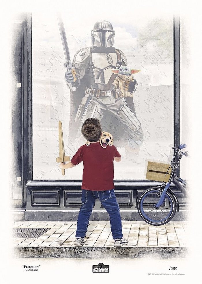 Some, however, are entirely original. For example, in Protectors by Al Abbazia, a young boy holds his puppy in one arm and a wooden sword in the other while he gazes at his reflection in a store window. The image reflected back, however, is not of himself but of the Mandalorian brandishing the darksaber and holding Grogu. Works such as these highlight the deep love creators and fans alike have for these storylines and characters.