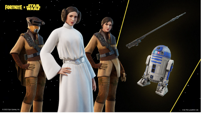 In the item shop, fans will find Luke, Leia, and Han in different outfits from the original trilogy. There will be back bling featuring R2-D2 and the Millenium Falcon, as well as an emote of your character riding a speeder bike as seen in Return of the Jedi while they were on Endor. The items are available separately or in two different bundle options.
