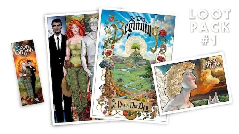 The Kickstarter is currently live for the Good Omens adaptation. If you back the Kickstarter, not only do you get the graphic novel, but you also some sweet Kickstarter rewards as well. Some of these include art prints from Colleen and other wonderful artists, limited edition enamel pins, trading cards, socks, notebooks a giant map, and more.