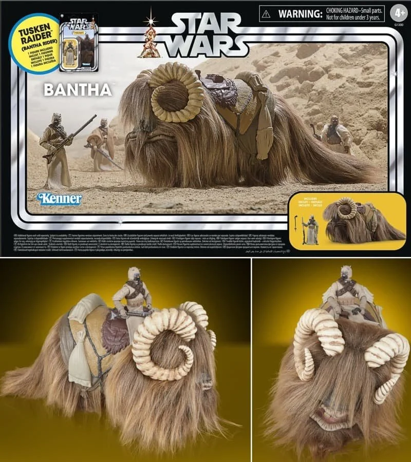 The Bantha has real fur and carries a detailed saddle on its back, which the Tusken can mount. The beast can move its head, legs, tail, and ankle joints and even open and close its mouth.
