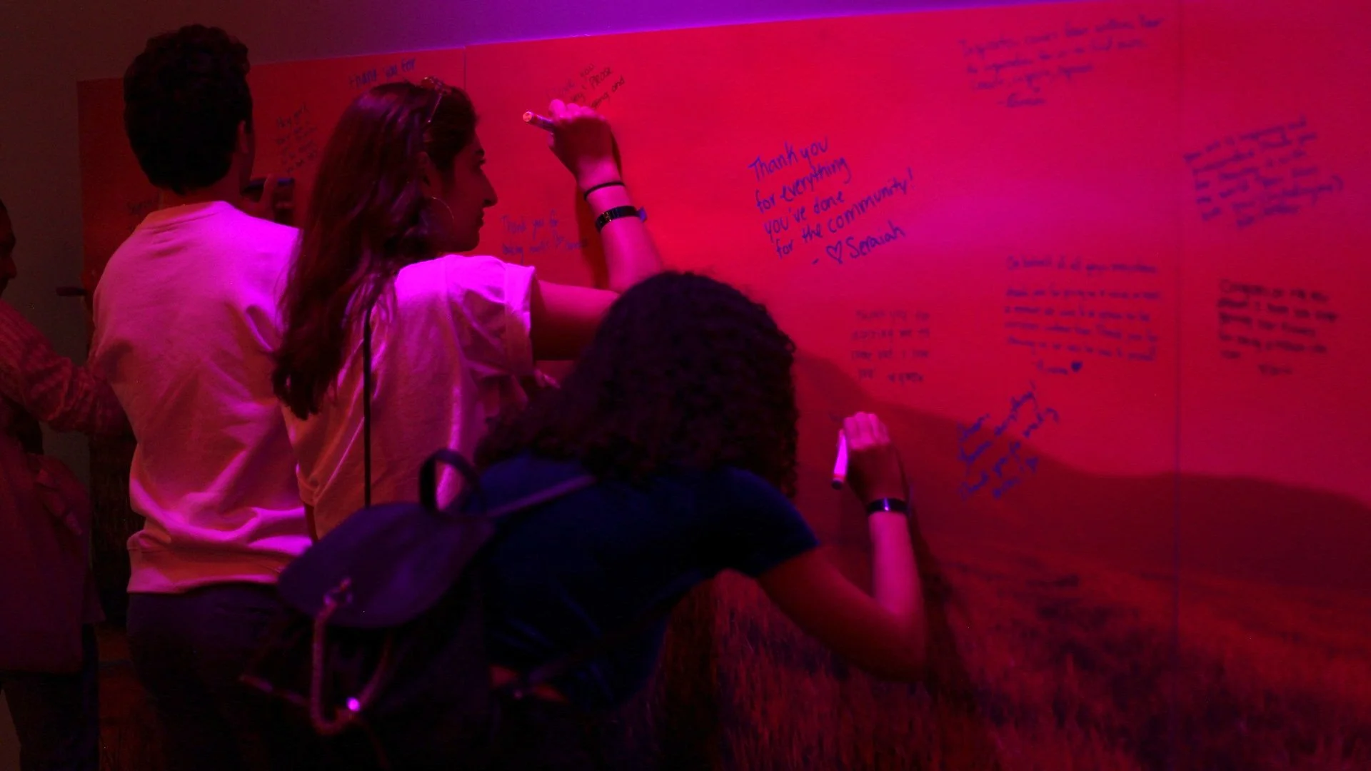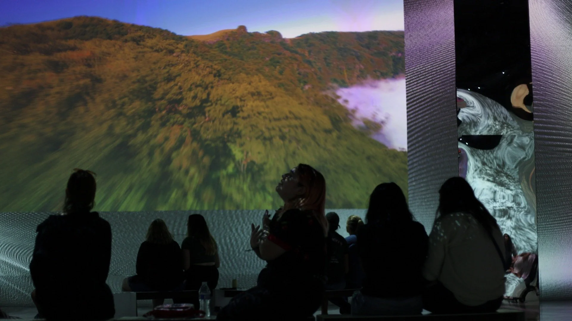 From there, attendees walked though a room that displayed Panorama art projected 360-degrees on the walls around them, and into a spacious viewing gallery with benches and further art projected around. It was there that Hayley Kiyoko walked out and introduced the album, then listened to all 13 tracks along with everyone, as picturesque visualizer videos accompanied each song.