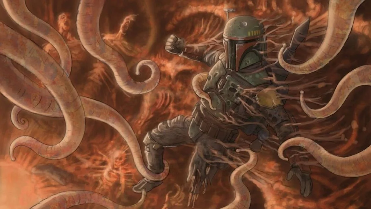 The season premiere of The Book of Boba Fett gave us a canonical version of the story. The Sarlacc suffered a fatal injury when an entire flaming barge landed on top of it. It lost a lot of its strength, and was subsequently dying. Boba was then able to launch a missile into its side and was able to crawl out. This was similar to the descriptions in Chuck Wendig’s 2016 canon novel Aftermath: Life Debt. This was certainly an escape worthy of the bounty hunter. However, in Legends, his escape was a lot crazier.