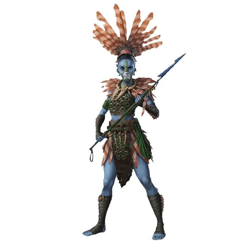 Namora, played by Mabel Cadena, is wearing a feather topped crown and a warrior-looking outfit. She looks ready to strike with her spear at any moment.