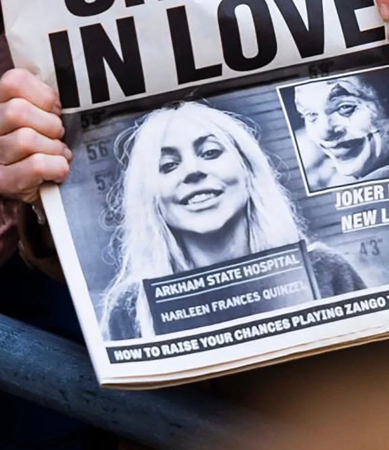 Thanks to the awesome invention that is the zoom lens, we’re treated to the front page of the Gotham Gazette with a mugshot of Harleen Frances Quinzel, an inlay of the Joker, and the words “CRAZY IN LOVE” in giant letters.