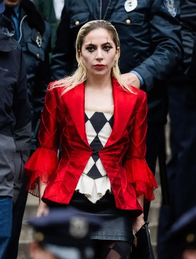 While not in full Harley Quinn gear like we’re used to seeing, Gaga wears a red blazer with frilled sleeves, a white and black top, a black skirt, and stockings. All of the different fabrics (with an exception of her skirt) have a diamond (also known as harlequin) pattern design, giving a fashionable yet subtle nod to her character.