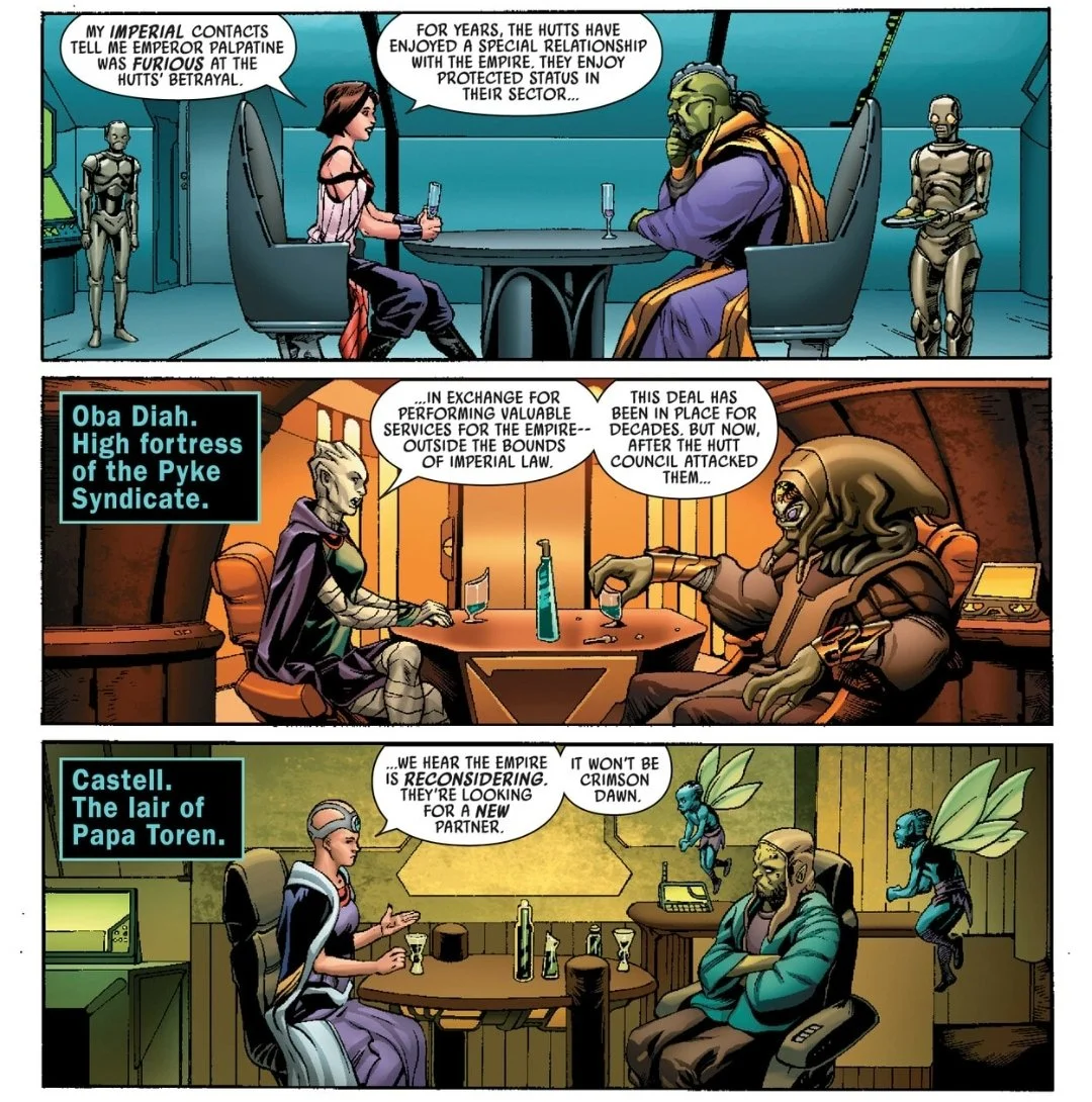 Lady Qi’ra begins by presenting Black Sun the opportunity to become the premier crime syndicate following the betrayal from the Hutts. After an attempt to capture a carbonite frozen Han Solo, the Hutt’s attacked an Imperial war ship in Star Wars: War of the Bounty Hunters. Qi'ra then goes on to imply that this made the Emperor furious and that he is now reconsidering his alliance with the Hutts and looking for a new partner. This message is shared with other crime lords, such as Papa Toren and the infamous Pykes. But planting the idea of working for the Emperor wasn’t the only plan Lady Qi’ra had for these crime families. She then sends out Chanath Cha and her Orphans to destroy a spice lab run by the Black Sun. After destroying the lab and leaving little to no survivors, they would go on to do the same to all crime organizations but leaving no clue as to who did it. This would incite the conflict between the Black Sun and other crime families.