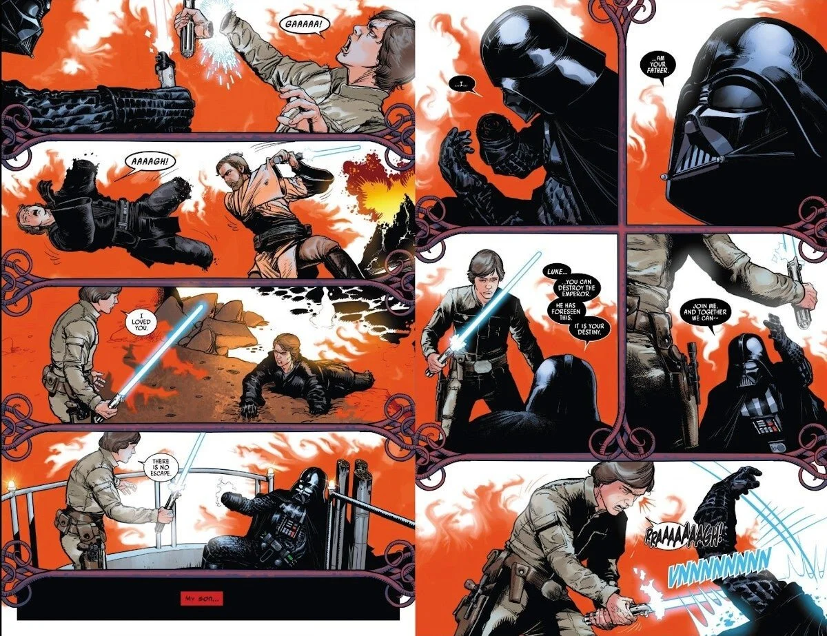 In this tenth issue of the comic series, Vader experiences some flashbacks to his duel with Obi-Wan Kenobi on the planet of Mustafar in Episode III - Revenge of the Sith where he lost parts of his body, and also Cloud City duel with Luke in Episode V - The Empire Strikes Back, and the famous phrase: “I am your father,” only this time with a different end.