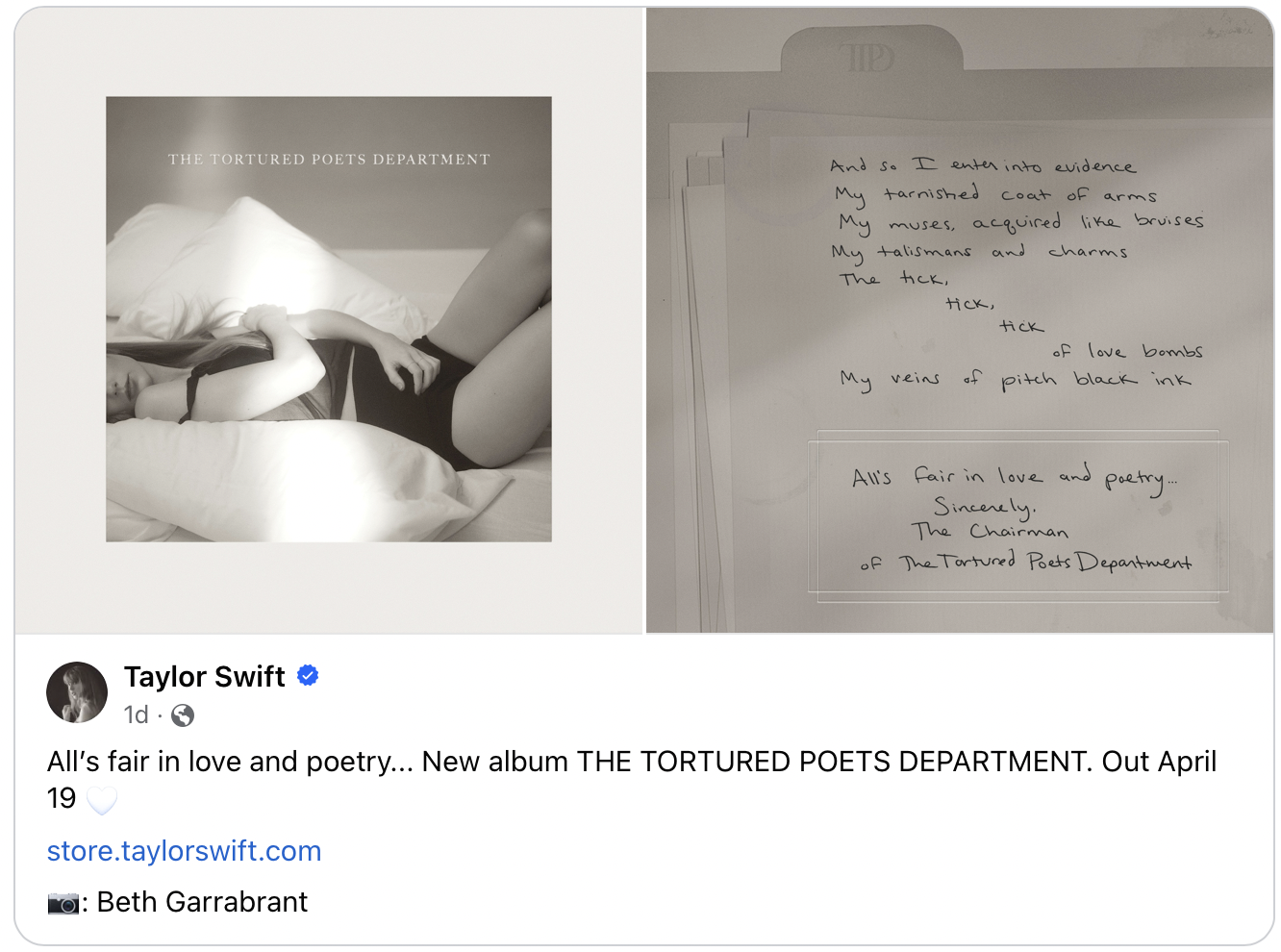 The album is called The Tortured Poet’s Department. As soon as the announcement was made, Taylor posted the cover and reveal on her social media with the note: “All’s fair in love and poetry… New album THE TORTURED POETS DEPARTMENT. Out April 19.” The album cover is black and white and features Taylor laying in bed. She also shared a photo of her writing, possibly lyrics to one or more of the songs on the album: “And so I enter into evidence / My tarnished coat of arms / My muses, acquired like bruises / My talismans and charms / The tick, tick, tick of love bombs / My veins of pitch black ink / All’s fair in love and poetry.” She ended the announcement with: “Sincerely, The Chairman of the Tortured Poets Department.”