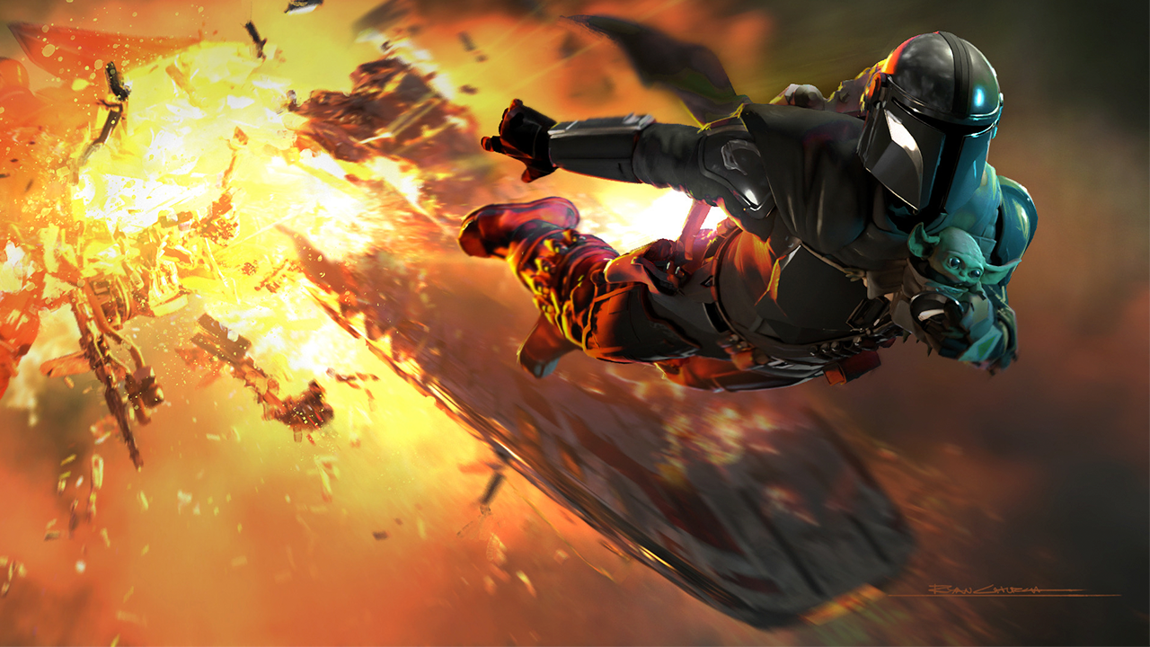 Din Djarin holding Grogu and jetpacking away from an exploding ship.