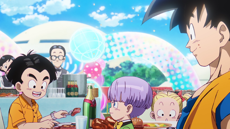 Meanwhile, on Earth, Trunks is celebrating his ninth birthday in the company of his parents, Bulma and Vegeta, Son Goku and his family (sans Gohan), Kurirn and his family, Mr. Satan, Majin Buu, Muten Roshi, Yamcha, Oolong, Puar, Piccolo, and even the Kaioshin and Kibito are in attendance. Of course, during the party, Goku and Vegeta decide to spar.