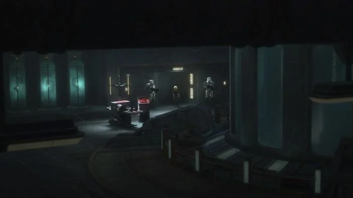 Omega and her brothers learn that Doctor Hemlock will be attending a high-level meeting at Tarkin’s compound. They plan to plant a tracking beacon on his ship that will hopefully lead them to his hidden base and Crosshair. The plan goes awry when Saw Gerrera shows up on his own mission and complicates everything. All hell breaks loose. The homing beacon on Hemlock’s ship is destroyed when Gerrera sets off the explosives he has planted in the building (failing to take out Imperial leadership in the process).